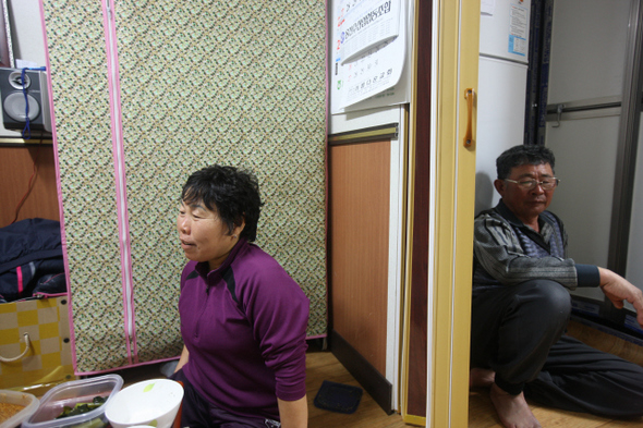 연평초등학교에 마련된 5평 남짓한 임시거주지 안에서 박옥환(61·오른쪽)·오선자(59)씨 부부가 포격 당일 상황을 설명하고 있다. 이들은 6천만원을 들여 개조한 집이 포격으로 전소돼 외손자와 함께 기약 없는 피난생활을 하고 있다.연평도=사진 한겨레 정용일 기자 yongil@hani.co.kr