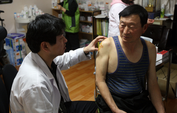 지난 3월8일 저녁 연평면 중부리 노인정에 마련된 인천의료원 임시진료소에서 한 주민이 진료를 받고 있다.연평도=사진 한겨레 정용일 기자 yongil@hani.co.kr