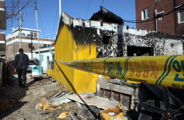 포격으로 불탄 뒤 100일이 넘도록 방치된 건물의 안전선 앞으로 주민이 지나가고 있다. 주민과 지자체 사이에 복구 대책에 대한 합의가 이뤄지지 않아 복구가 지연되고 있다.연평도=사진 한겨레 정용일 기자 yongil@hani.co.kr