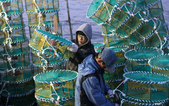 선착장에서 선원들이 돌게잡이 조업 준비를 하고 있다.연평도=사진 한겨레 정용일 기자 yongil@hani.co.kr