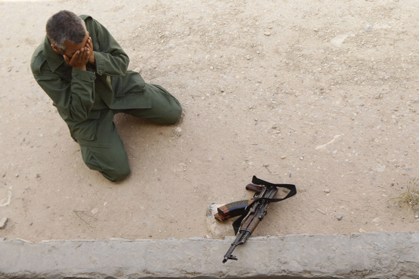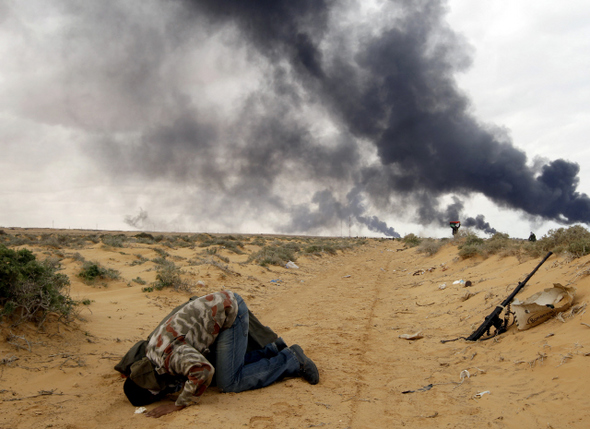 리비아 수도 트리폴리에서 남서쪽으로 90km 떨어진 도시인 칼라의 검문소에서 한 반군이 총을 땅에 내려놓은 채 기도하고 있다. REUTERS