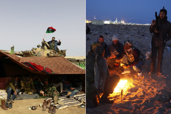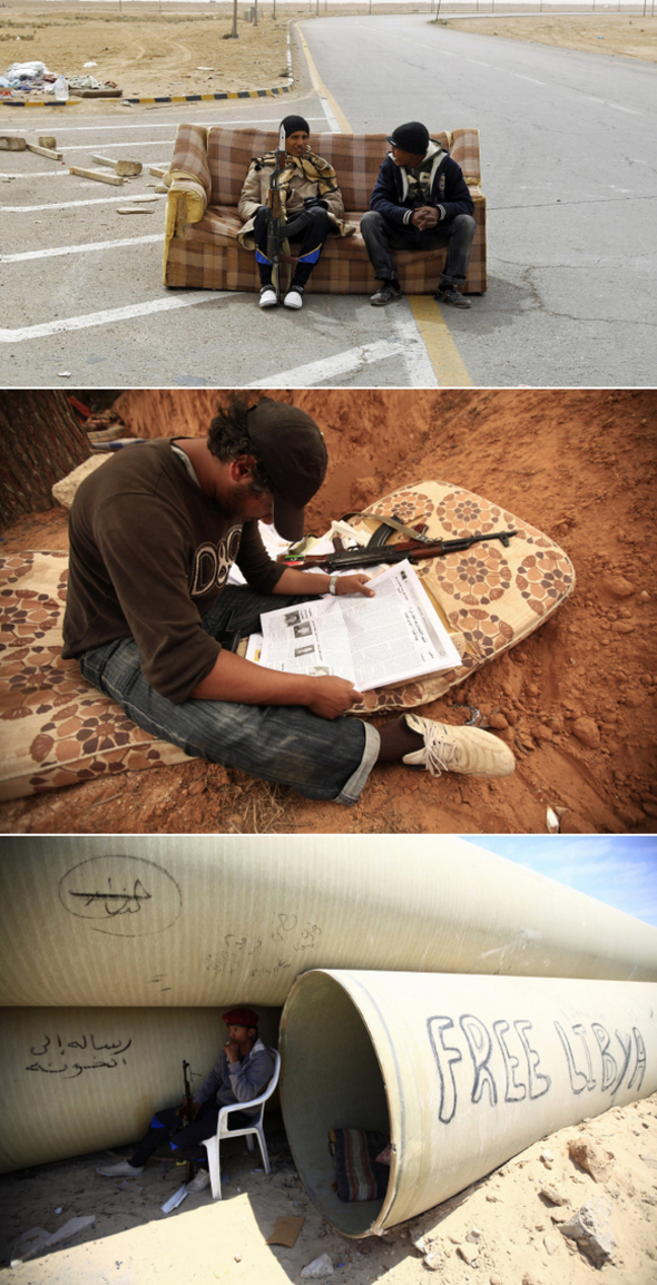 아즈다비야의 한 검문소에서 반군들이 소파에 앉아 얘기하고 있다(맨 위 사진). 미스라타의 서부전선 초소에서 한 반군이 신문을 읽고 있다(가운데 사진). 미스라타의 대형 송유관 사이에 앉아 쉬고 있는 반군(맨 아래 사진). REUTERS