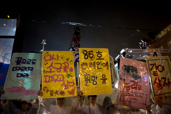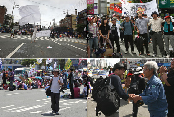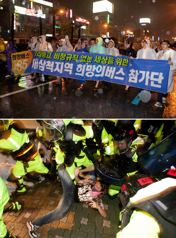 서울을 비롯해 전국 각지에서 출발한 희망 버스 195대 승객 9천여 명이 보낸 1박2일은 날씨마저 그렇게 강렬했다. 여기에 경찰의 강렬한 최루액과 물대포가 더해졌다. 강렬한 곤봉 세례도 빠지지 않았다. 그러나 김진숙씨와 한진중공업 노동자들을 만나려는 희망 버스 승객들의 희망은 멈추지 않는다.