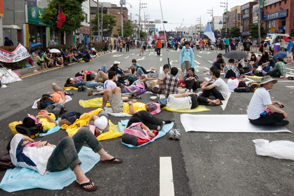 경찰의 진압과 폭우 속에서도 자리를 뜨지 않고 현장에서 노숙을 하고 있는 참가자들. 한겨레21 박승화