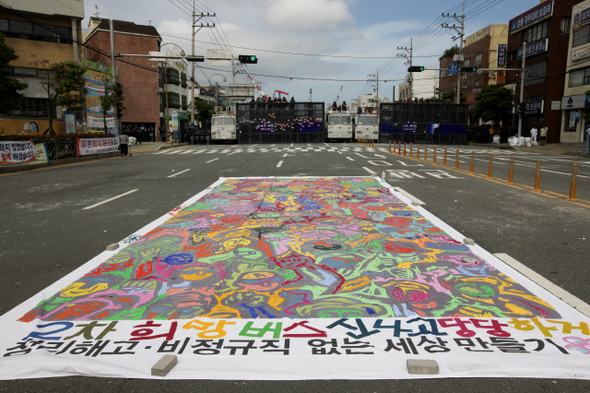 참가자들이 돌아간 뒤 경찰이 차벽으로 막고 있는 도로 위에 제2차 희망의 버스 참가자들이 그린 대형 그림이 놓여 있다. 한겨레21 박승화