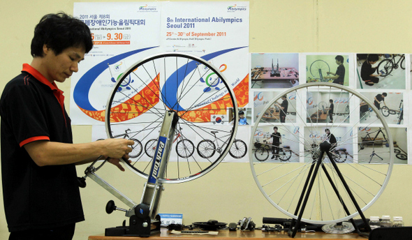 조성국(34·지체6급, ‘자전거 조립’ 부문)씨가 자전거 부품을 매만지고 있다.