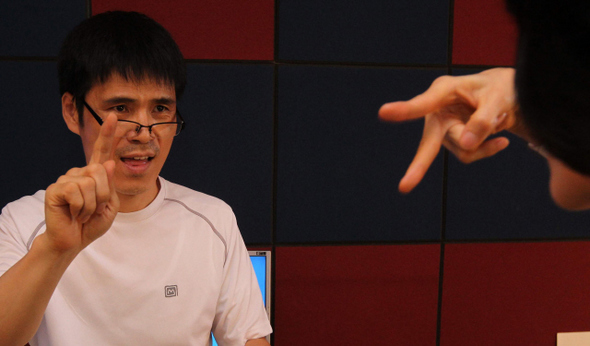 박병후씨와 훈련지도사(수화통역) 김화진씨가 수화로 대화하고 있다.