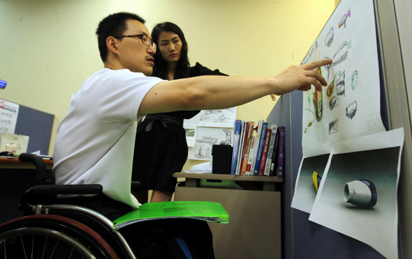우송식(왼쪽, 36·지체1급, ‘제품디자인’ 부문)씨는 2007년 교통사고를 당했으나 너무 바빠서 고통에 빠질 틈이 없었다. 집중력이 뛰어나 연습하다 욕창이 생기기도 했다. 훈련 도중 대회 과제인 헤어드라이어 디자인 연습 작품을 두고 장애인올림픽 조직위원회 안희 과장과 이야기를 나누고 있다.