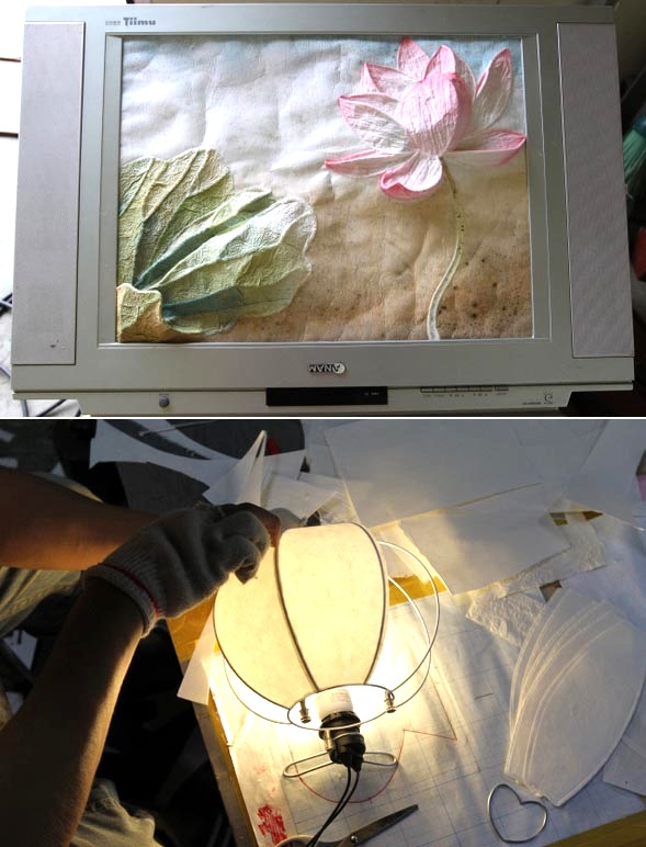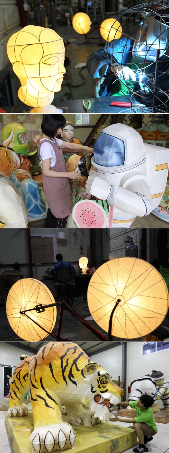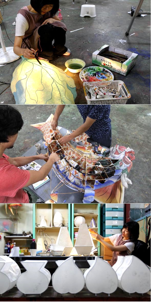 등에 조명이 들어온 상태에서 채색 작업을 한다.(맨 위쪽 사진) 오래돼 낡은 등을 보수하려고 뼈대에 붙은 한지를 벗기고 있다.(위에서 두번째 사진) 행사에 사용할 등을 다양한 모양으로 만들고 있다.(맨 아래 사진) 한겨레21 정용일