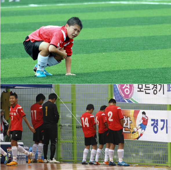 한 선수가 경기 도중 고통스런 표정으로 무릎을 감싸 쥐며 일어서려 하고 있다(위 사진). 경기 시작이 임박하자 긴장한 선수들이 그라운드 한쪽에서 소변을 보고 있다. 어린 선수들의 경기에서는 경기가 시작되기 직전에 이런 풍경이 자주 벌어진다. 아무리 급해도 소변은 화장실에서! (아래 사진). 한겨레21 김경호