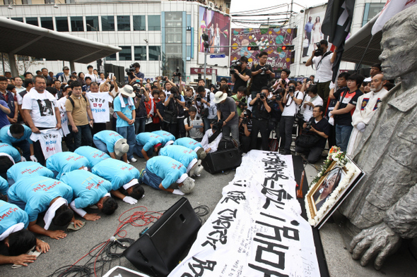 서울 청계천 ‘전태일 다리’에서 기륭전자, 쌍용자동차, 한진중공업, 전북고속 노동자들이 전태일 열사의 동상과 이소선 여사 영정 앞에 절을 하고 있다. 한겨레21 박승화