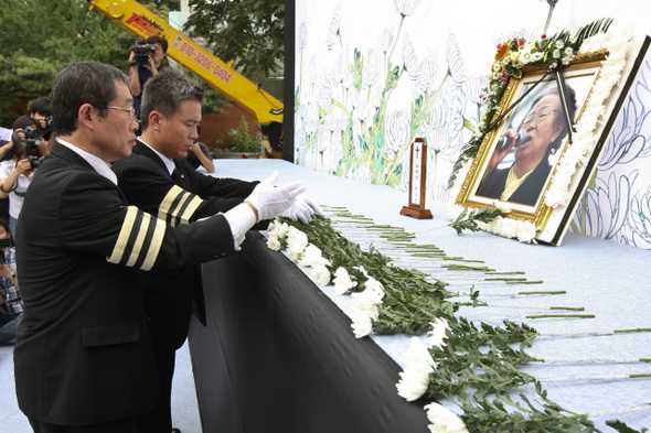 서울 대학로에서 열린 영결식에서 김영훈 민주노총 위원장과 이용득 한국노총 위원장이 헌화를 하고 있다. 한겨레21 박승화