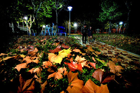 플라타너스의 넓은 잎이 떨어져 쌓인 낙엽길을 연인들이 산책하고 있다. (서울 노원구 마들체육공원)