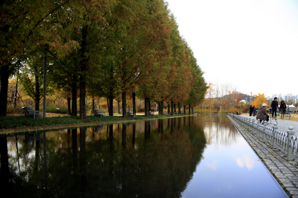가을빛은 물속에도 고이 담긴다. 서울 성동구 서울숲의 메타세쿼이아.