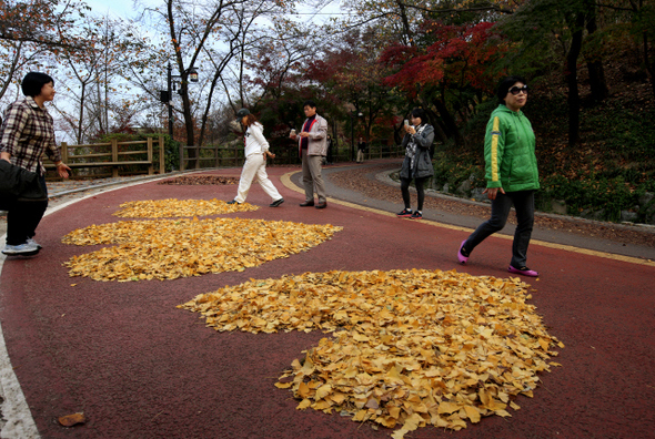 마음씨 따뜻한 청소 아저씨가 낙엽을 쓸어모아 정성 들여 만든 하트가 산책길의 시민들에게 사랑을 전하고 있다. (서울 중구 남산 산책로)
