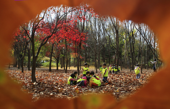 낙엽이 수북이 쌓인 숲에서 아이들이 놀고 있다. 아이들에게도 이 가을은 특별한 기억으로 남을 것이다. (서울 서초구 양재시민의 숲)