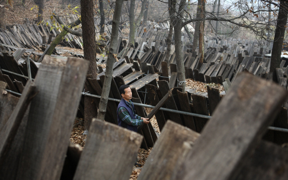 경기도 하남에 위치한 공방 뒤 야산에서 5년 이상 곰삭은 오동나무를 고흥곤 악기장의 조교인 김영렬씨가 살펴보고 있다.