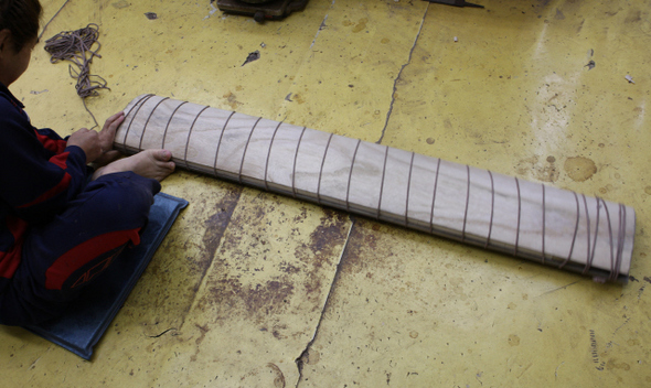 가야금의 위 몸체인 오동나무와 아래 바닥인 밤나무를 접착한 뒤 끈으로 묶어 고정하고 있다.
