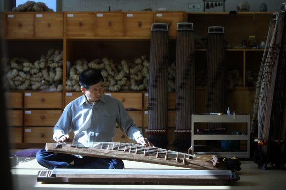 고흥곤 악기장이 서울 서초동의 국악연구원 사무실에서 완성된 가야금의 현을 점검하고 있다.