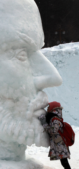태백산도립공원에서 한 관광객이 스티브 잡스의 눈조각과 입맞춤을 하고 있다.