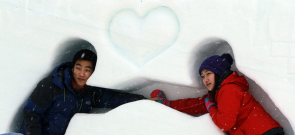 태백산도립공원에서 연인들이 눈조각 앞에서 기념사진을 찍고 있다.