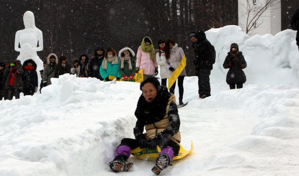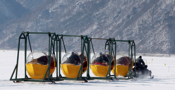 인제 빙어축제장에서 관광객들이 대형 썰매를 타고 있다.