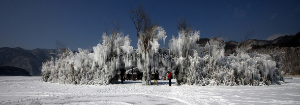 강원도 인제군 남면 인제대교 밑에 눈과 얼음이 어우러져 만들어진 자연 조각물을 관광객들이 살펴보고 있다.