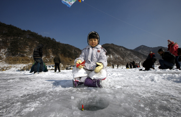 강원도 인제 빙어축제장을 찾은 한 소녀가 빙어낚시를 즐기고 있다.