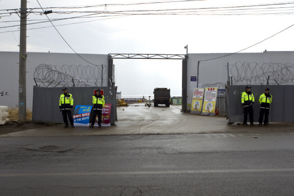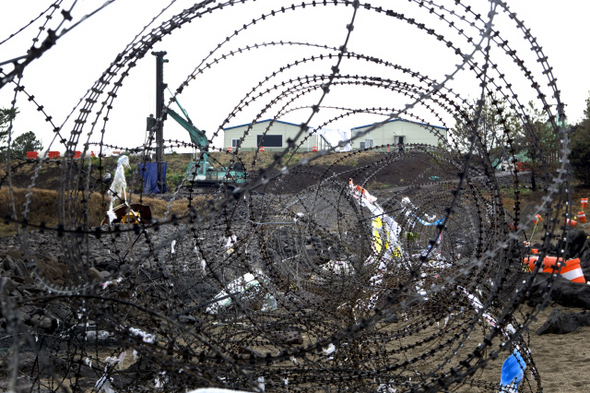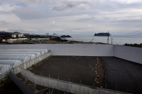 제주도 강정마을. 해군기지 공사현장을 둘러싼 벽./2012.2.14/한겨레21박승화