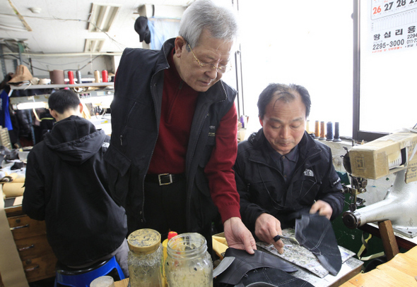 세창정형제화연구소에서 구두를 만드는 직원들은 대부분 남궁정부씨와 오랜 동지다. 남궁정부씨가 외피 작업을 하고 있는 직원과 작업 내용에 대해 이야기를 나누고 있다.