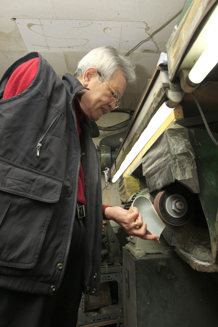 남궁정부씨가 구두의 형태를 다듬으려고 기계로 작업을 하고 있다.