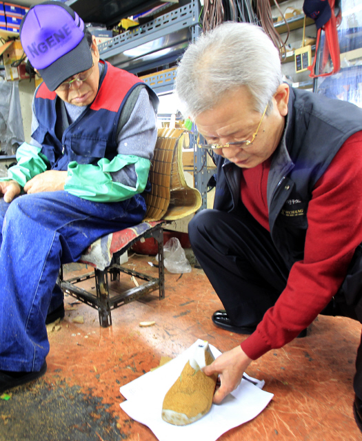 남궁정부씨가 고객의 주문 사항이 적힌 주문서에 구두 모형을 대보며 직원과 의견을 나누고 있다.