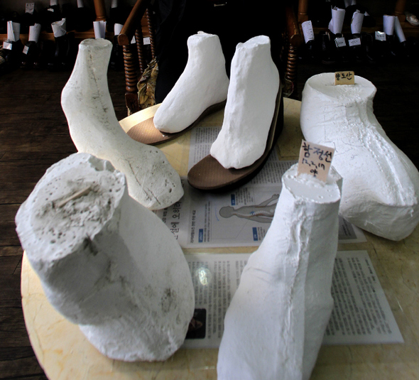 세상에는 의외로 발이 불편한 사람이 많다. 남궁정부씨 책상에는 장애를 지닌 고객들의 발 모양 석고상이 늘 가득하다.