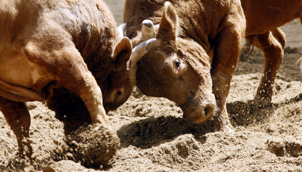 2012 청도 소싸움 축제에 참가한 청도의 박광(왼쪽)과 김해의 계룡이 서로 머리를 맞대고 뿔치기 공격을 하고 있다.