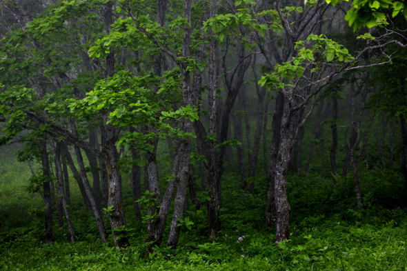 낮게 깔린 6월의 잿빛 구름이 등산객들과 나란히 걷는다. 숲에는 오직 사람의 숨소리와 바람이 잎사귀를 훑어내는 소리뿐이다. 짙푸른 참나무숲 사이로 희고 노란 야생화가 지천이다. 사상자, 꽃쥐손이, 요강나물, 미나리아재비, 쥐오줌풀, 하늘매발톱, 줄딸기꽃, 미나리냉이, 노랑장대, 풀솜대, 벌깨덩굴, 눈개승마, 매자나무꽃…. 내 몸을 낮춰 바짝 웅크려야만 볼 수 있는 겸손한 꽃들. 세상도 이와 같을 것이다. 몸을 낮춰야 가슴까지 차오르는 기쁨을 맛볼 수 있으니까. 구름 사이로 볕이 비치는가 싶더니 소나기가 한바탕 헤살을 놓는다. 안개가 몰려온다. 실루엣만 보이는 원시향, 천상의 에덴동산이다. 숲의 비밀을 한 꺼풀씩 벗겨주는 날씨의 요술이 신기하기만 하다. 안개비는 그새 두문동재의 금대봉을 삼켜버렸다.