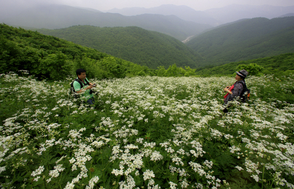 백두대간의 첩첩산중에 전호꽃이 흐드러지게 피어나 탐방객들의 탄성을 자아내고 있다.