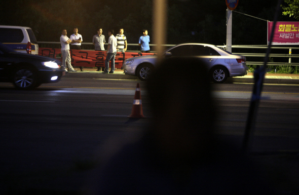 경찰들이 파업 중인 화물연대 조합원들을 감시하고 있다.