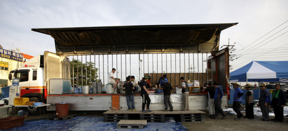 화물연대 서울·경기지부 조합원들이 지난 6월26일 트럭을 이용한 간이식당에서 저녁 식사를 배급받고 있다.