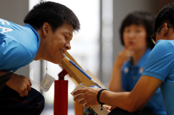 보치아 국가대표인 정호원(25) 선수가 보조기구를 이용해 공을 밀고 있다. 정 선수는 베이징장애인올림픽과 벨파스트 세계보치아월드컵대회 개인전에서 금메달을 딴 보치아 1인자다. 보치아는 공을 경기장 안으로 굴리거나 발로 차서 표적에 가장 가까이 보내는 경기다.