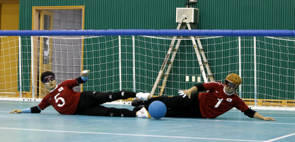 시각장애인 게임인 골볼 국가대표 선수들이 공의 소리와 감각에 의지해 넘어지며 수비를 하고 있다. 골볼 게임은 시야를 완전히 가리려고 눈에 아이패치와 고글을 착용하고 시합을 한다.