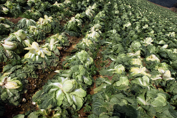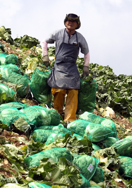 강원도 강릉시 왕산면 대기리, 해발 1100m 가 넘는 곳에 안반데기(안반덕)마을이 있다. 한여름 햇볕이 누그러지는 8월 말이면 다 자란 배추가 온 산, 온 마을을 뒤덮어 장관을 이룬다. 안반데기는 떡메로 내리칠 때 쓰는 ‘안반’을 연상시킨다 하여 붙여진 이름이다. 1965년부터 산을 깎아 개간하고 화전민들이 정착하며 형성되었다. 지금은 195ha(60만 평)에 이르는 땅에서 고랭지 배추를 출하한다. 보통 10여 명이 한 팀을 이루는 외부 농사 인력이 들어와 새벽 2시부터 오후 6시까지 하루에 1만 포기 정도 작업을 한다. 올해는 여기서도 폭염과 병충해로 작황이 좋지 않다는 이야기가 들려온다. 작황이 좋지 않으면 가격이 오르지만 배추 가격이 금값으로 올라도 정작 농민들에게 돌아오는 혜택은 없다. 재배하기 전 1포기당 가격을 책정해 트럭 수로 계약하기 때문이다.