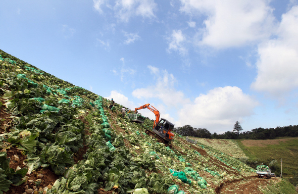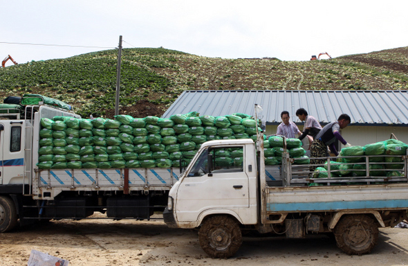 안반데기마을의 배추밭은 경사가 급해서 굴착기에 바구니를 달아 배추를 옮긴다.