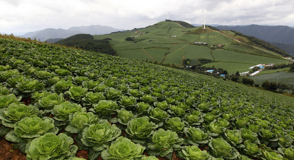 안반데기 언덕에 올라서면 굽이굽이 펼쳐진 배추밭이 한눈에 펼쳐진다.