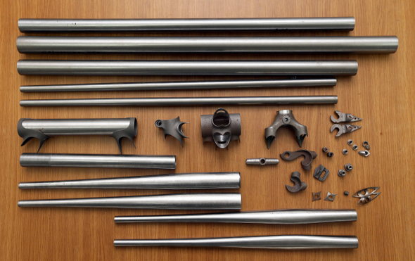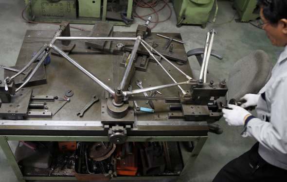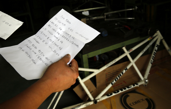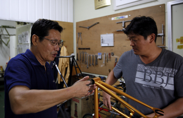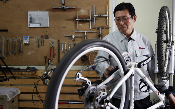 40년을 같이해온 자전거 제작대 위에서 자전거를 조립하고 있다.