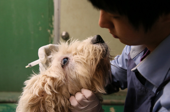 큰 유기견을 관리하는 유영모(27)씨가 감기에 걸린 유기견을 치료해주며 건강 상태를 점검하고 있다. 사진 정용일 기자
