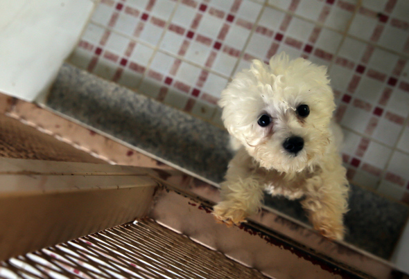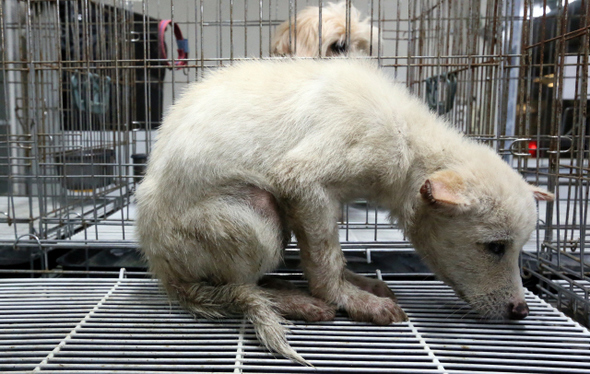구조대원이 데려온 한 유기견이 낯선 환경 탓인지 무서워하고 있다. 사진 정용일 기자