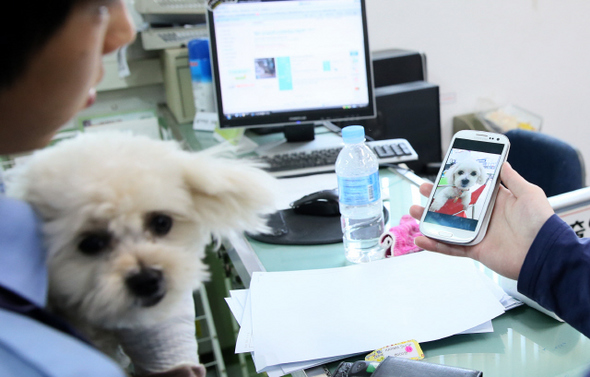 한국동물구조관리협회 홈페이지를 보고 잃어버린 강아지를 찾으러 온 한 시민이 확인 작업을 하고 있다. 사진 정용일 기자