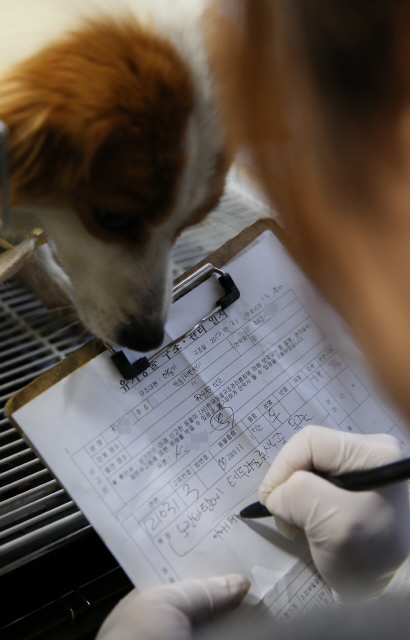 바로 들어온 유기견들은 신고자의 이름과 구조 위치가 적힌 차트에 건강 상태가 적힌다. 사진 정용일 기자