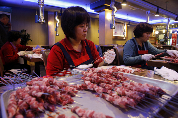 ‘송화양꼬치전문점’ 직원들이 양고기를 꼬치에 꿰고 있다.