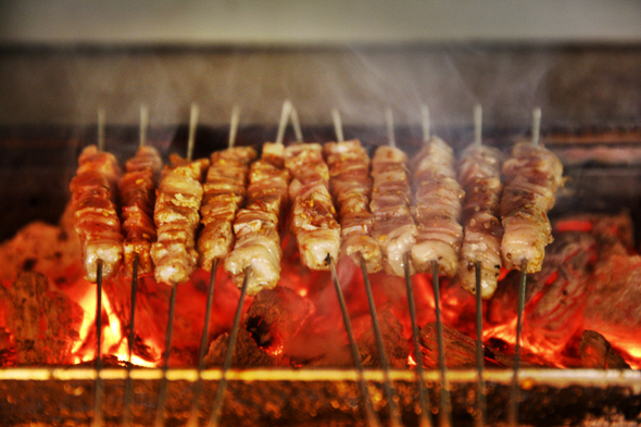 양고기를 숯불에 굽고 있다. 양꼬치에 주로 사용하는 양고기는 6개월에서 1년 사이의 어린양 램이다. 양고기에 입히는 소스는 가게마다 다르지만 양고기 특유의 잡냄새를 없애주는 향신료 쯔란(커민)은 꼭 들어간다.